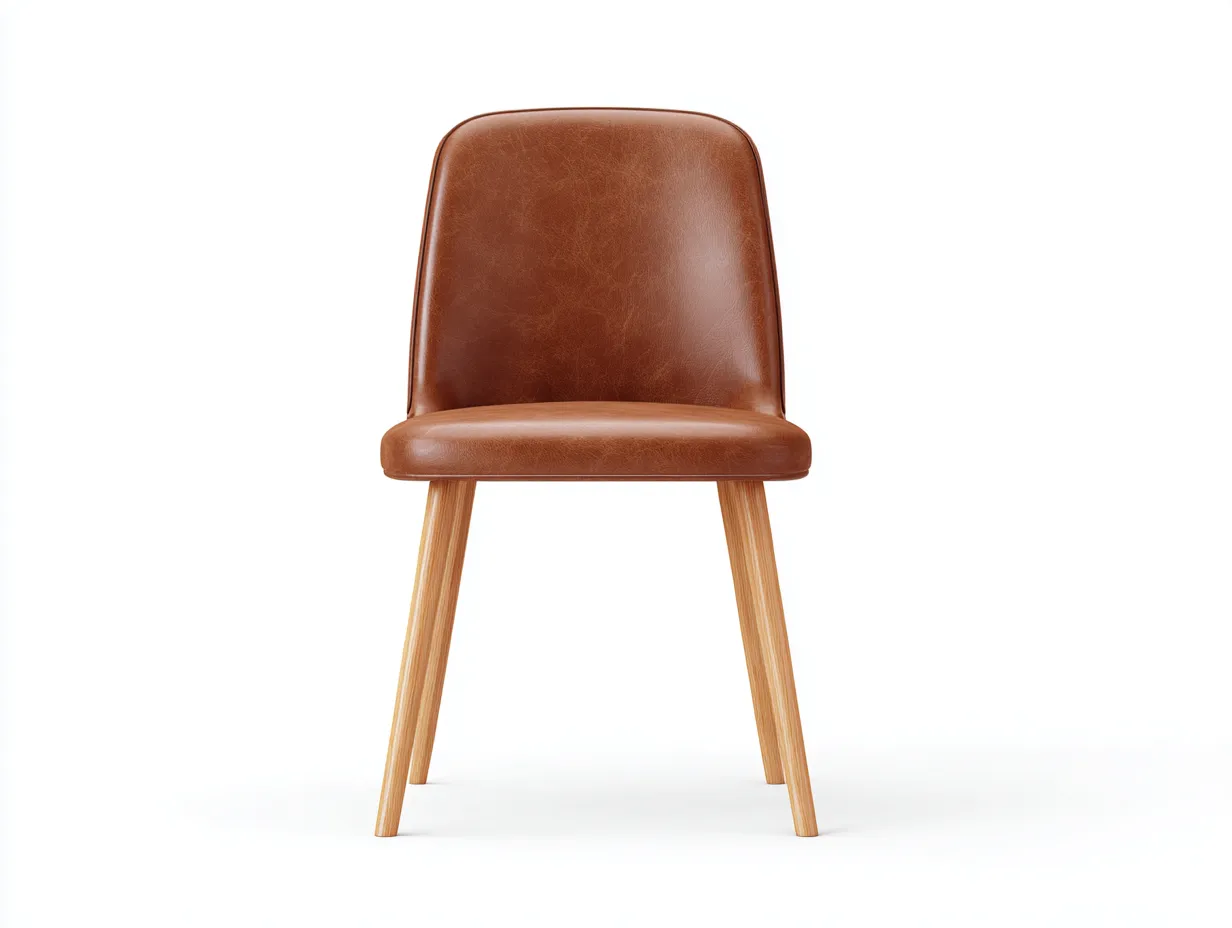 Siedzisko oraz oparcie pokryto skórą ekologiczną w kolorze brązowym o subtelnej strukturze i naturalnym wyglądzie. Nogi wykonano z drewna w jasnym odcieniu, co zapewnia stabilność oraz trwałość konstrukcji. Starannie wykonane detale podkreślają estetykę produktu.