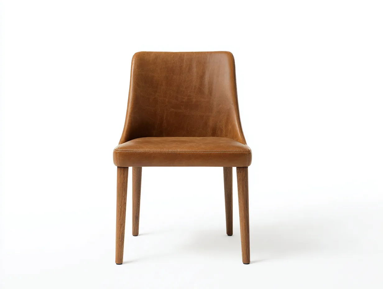 Siedzisko i oparcie pokryto skórą ekologiczną w kolorze brązowym o delikatnej strukturze. Konstrukcja opiera się na drewnianych nogach w naturalnym odcieniu, które zapewniają stabilność oraz trwałość użytkowania. Starannie wykończone krawędzie i przeszycia podkreślają estetykę wykonania.